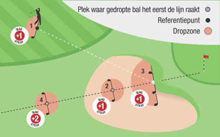 Het kost je 1 strafslag en je gaat dan op de lijn van de bal en de vlag naar net zover naar achteren als jij wilt, buiten de bunker, en dropt de bal op de lijn.